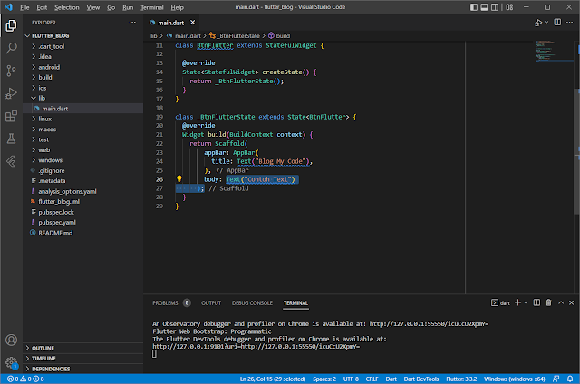 Jadi di situasi ini kita menuliskan flutter create flutter_blog. Dengan perintah cd kita masuk ke folder flutter_blog lalu ketik perintah code . [ Enter ]