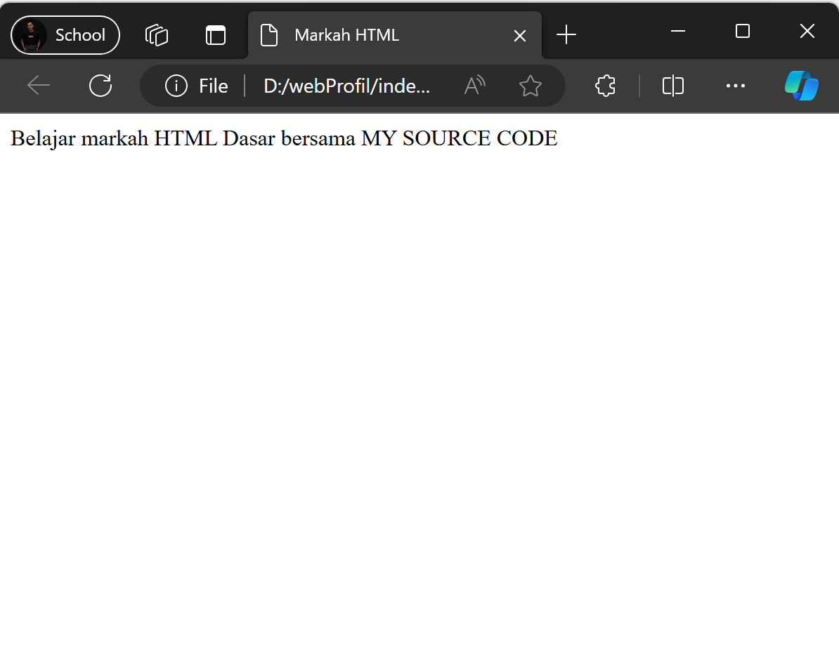 Sekarang, mari tambah bagian <body> dengan kalimat "Belajar markah HTML Dasar bersama MY SOURCE CODE"