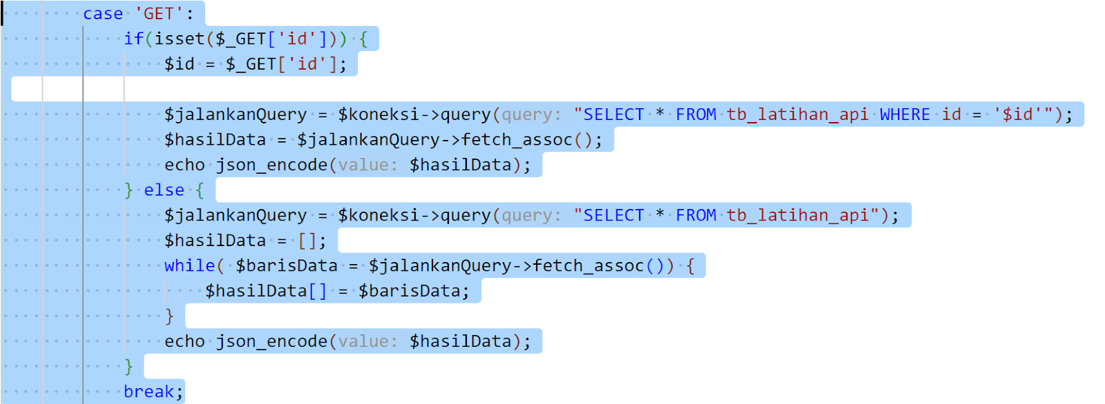 Selanjutnya tambahkan di bawah break untuk mengambil data dari basis data